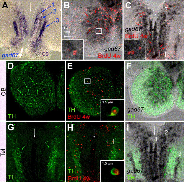 Fig. 5 Telencephalic progenitors give rise to gad67- and/or TH-positive neurons in the OB and in the anterior subpallium and medial pallium. Localization of GABA-ergic neurons, revealed by gad67 (A–C, F, I) (ISH, blue or black) expression and compared with the expression of TH (D–I) (immunodetection, green) and/or the localization of BrdU-positive cells after 4 weeks of tracing (B, C, E, H) (red). Panels B and D–F are focussed on the OB, panels C and G–I on the subpallium and medial pallium, white arrows to the midline. All views are cross-sections, anterior up, panels B–I are confocal photomicrographs. In the OB, newborn neurons in the IL largely express gad67 (B, red arrows to examples of double-positive cells, one example is magnified in inset). Most TH-positive neurons in the GL (D) are gad67-positive (F, green arrows to examples of double-positive cells) and a subset of these neurons are newborn (E). In the subpallium and medial pallium, gad67 expression is organized in three bilateral columns (numbered 1–3 in A, C, I), which largely contain newborn neurons (C red arrows to examples of double-positive cells, one example is magnified in inset). Some newborn neurons also express TH (H), but these are mostly not GABAergic (I, green arrow to the restricted subpopulation of gad67/TH double-positive cells).