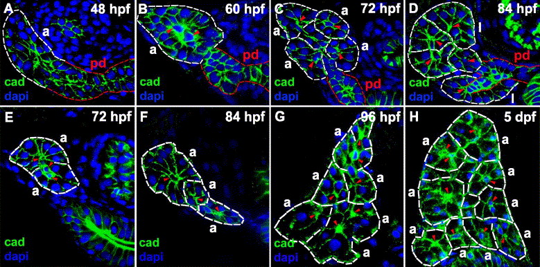 Fig. 6 Acinar gland morphogenesis during larval development. (A–D) Histological sections through the anterior pancreas (rostral to islet) of larvae processed for cadherin (green) immunohistochemistry and dapi (blue). The main pancreatic duct and the acini are demarcated (red and white dashed lines respectively), and centroacinar cells are indicated (red arrowheads). (A) At 48 hpf, the distal end of the main pancreatic duct appears as a multi-layered stratified epithelium (white dashed lines). (B) By 60 hpf, a primitive acinus-like structure is formed. (C) At 72 hpf, four distinct acini are recognized. (D) By 84 hpf, two exocrine lobules are evident. (E–H) Histological cross-sections through the pancreas (caudal to islet) of larvae processed for cadherin immunohistochemistry (green) and dapi (blue). Acini (demarcated by white dashed lines) are shown. Acinar number increases on successive days post-fertilization. Two, three, six and nine acini are identified in these 72 hpf (E), 84 hpf (F), 96 hpf (G) and 5 dpf (120 hpf) (H) larvae, respectively. pd: pancreatic duct; a: acinus; l: exocrine lobule; cad: cadherin.