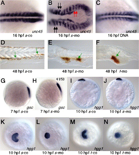 Fig. 5 Sid4 function during development of ventral and prechordal mesoderm. (A) In s-co embryos, somitic mesoderm develops normally. (B) Somite shape and convergence of caudal somitic mesoderm are disrupted in s-mo embryos. Somites anterior (black arrows) to and involved in (red arrows) the convergence defect are similarly malformed. (C) Somite development was normal in embryos injected with 25 pg/nl of sid4 expression DNA. (D–F) Red blood cells stained with o-dianisidine. (D) Red blood cells can be seen within the vasculature of 24 hpf control embryos (green arrows). (E) In s-mo and (F) t-mo embryos, isolated red blood cells are seen in the proximity of blood vessels (green arrows), but the vast majority remain clumped within the abnormally expanded inner cell mass. (G) Anterior migration of gsc-expressing cells was similar in 7 hpf s-co and (H) s-mo embryos. (I) The anterior position of hgg1 hybridization beneath the eye primordium of 10 hpf s-co and (J) s-mo embryos was also normal. (K) Lateral migration of hatching gland cells is normal in s-co and (M) t-co morphants. (L) In both 10 hpf s-mo and (N) t-mo morphants, hatching gland cells do not spread but remain in the midline. Embryonic stages and treatment are indicated below each panel. In situ probes are indicated at the lower right of each panel. Anterior is to the left. A–J are lateral views. K–N are anterodorsal views.