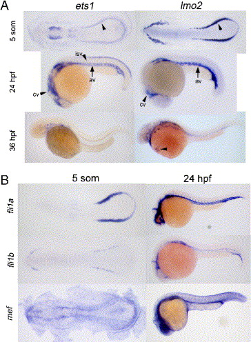 Fig. 6 lmo2 is coexpressed with multiple ETS factors. (A) Developmental expression of ets1 and lmo2 at the 5-somite, 24 and 36 hpf stages. Both genes are expressed in the posterior mesoderm at 5 somites (arrowheads). At 24 hpf, both are expressed in the ICM, cranial (cv), and axial vessels (av). At 36 hpf, lmo2 is maintained in endothelial and circulating cells (arrowhead) while ets1 is in a subset of vessels but is not seen in circulating blood. (B) Other ETS factors are coexpressed with lmo2 in the ventral mesoderm at the 5-somite stage and ICM at 24 hpf. fli1a, fli1b, and mef/elf4 are ETS factors that could have redundant or cooperative roles with ets1 in regulating lmo2.