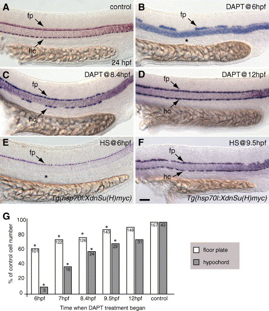 Fig. 2 Notch signaling is required during gastrulation for hypochord specification and a complete floor plate. (A–F) Side views, anterior to the left, of 24 hpf embryos showing col2a1 expression in the floor plate (fp) and hypochord (hc). (A) Control embryo incubated in 1% DMSO showing normal floor plate and hypochord arrangement. (B) Embryo treated with DAPT at 6 hpf to block Notch signaling. Floor plate was reduced, whereas hypochord was absent (asterisk). (C) Embryo treated with DAPT at 8.4 hpf (80% epiboly, midgastrulation) showing fewer hypochord cells. Floor plate cells form a complete row but are fewer in number (see G). (D) Embryo treated with DAPT at 12 hpf (6-somite stage) showing complete rows of both hypochord and floor plate. (E) Tg(hsp70l:XdnSu(H)myc) embryo heat-shocked at 6 hpf had no hypochord cells (asterisk). (F) Tg(hsp70l:XdnSu(H)myc) embryo heat-shocked at 9.5 hpf developed a complete row of hypochord cells. (G) We counted the number of col2a1-expressing floor plate and hypochord cells between somite 1 and 17 in control embryos and embryos treated with DAPT at the different times indicated. Embryos treated with DAPT at 6 hpf had reduced floor plate and few hypochord cells, whereas embryos treated with DAPT at later times had less severe floor plate and hypochord defects. Floor plate and hypochord cells were counted in ten embryos per sample, and the average number of cells (number shown within each bar) is expressed as a percentage of the control value (100%). Asterisks (*) indicate significance beyond the 0.001 level using Student′s t test. Scale bar: 40 μm for panels A–F.