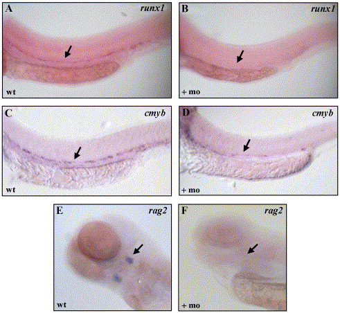Fig. 4 Loss of definitive hematopoietic gene expression in scl morphants. Transcripts for runx1 (A, B), cmyb (C, D), and rag2 (E, F) were absent in scl morphants. In A–D, arrow indicated the region of expression along the ventral wall of the dorsal aorta. In E and F, arrow indicates expression in the thymic rudiment, ventral views.