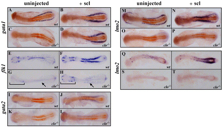Fig. 8 Analysis of hematopoietic and endothelial expansion in clo in response to forced expression of scl. Double ISH (A–D, I–P) using myoD in red and gata1, gata2, or lmo2 in blue, or single ISH using flk1 (E–H) or lmo2 (Q–T), in wild-type and clo-/- embryos injected with scl RNA (+scl) or uninjected controls, as indicated. In G, H, brackets indicate anterior endothelial cells, and arrows indicate posterior lateral mesoderm. In I and J, arrowhead indicates expression of flk1 in the tail bud. Embryos are between the 10- and 12-somite stage (A–P) or the 20 somite stage (Q–T).
