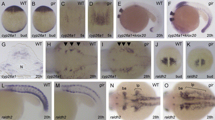 Fig. 5 Expression of cyp26a1 and raldh2 is affected in the gir mutant. Expression of cyp26a1 (A–D and G–I), cyp26a1 and krox20 (E and F), and raldh2 (J–O) in the wild type (A, C, E, G, H, J, L, and N) and gir mutant (B, D, F, I, K, M, and O) embryos. (A and B) cyp26a1 expression in the presumptive anterior neural ectoderm and in the tailbud is little affected at bud stage in the gir mutant. Dorsal views are shown. (C and D) At the 5-somite stage, cyp26a1 expression in the rostral presumptive spinal cord is upregulated in the gir mutant. (E and F) At 20 hpf, cyp26a1 expression is strongly upregulated in the rostral spinal cord and in the tailbud of the gir mutant. (G) A transverse section at the level of the rostral spinal cord showing cyp26a1 expression in the wild-type embryo at 20 hpf. N, notochord. (H and I) cyp26a1 expression in the developing branchial arches (indicated by the arrowheads) is perturbed at 28 hpf in the gir mutant. (J–M) raldh2 expression in the presomitic mesoderm and in the somites is reduced in the gir mutant at bud stage (K) and 20 hpf (M). (N and O) At 28 hpf, raldh2 expression in the posterior branchial arch primordium (ba) and in the posterior fin bud- and lateral plate-mesoderm (lp) is disturbed in the gir mutant. Genotypes were determined by PCR assay after the photographs had been taken in A–F and J–M.
