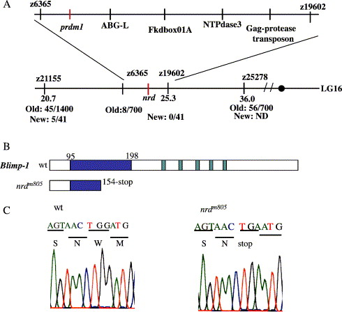 Fig. 1 Linkage between nrd and prdm1. (A) Physical and genetic maps of zebrafish linkage group (LG) 16. The genomic interval that contains nrd was determined using bulk segregant analysis with single strand length polymorphic (SSLP) markers (āzā positioned before the number). We positioned nrd between z6365 and z19602. Recombination frequency is listed as old and new. Old is from the original nrd strain nrdm805EK/WIK and New is nrdm805HuC:GFP. Several genes are located in this interval, including prdm1, which we identified as a candidate (Sanger Zv3 ensembl; other genes in the region include ABG-L, Fkdbox01A, NTPdase3, Gag-protease transposon). (B, C) Sequence comparison of wildtype (wt) and nrdm805 prdm1. (B) Diagrams illustrate conceptual wildtype and nrdm805 Blimp-1 (prdm1) protein products. The wildtype sequence contains a SET domain (blue) between amino acid 95ā198 and 5 zinc finger DNA binding domains (green). The nrdm805 sequence has a stop codon (TGA) at amino acid 154 (exon 4) within the SET domain and before the zinc finger domains. (C) Sequence comparison between wildtype (wt; left) and nrdm805 (right). Sequence was confirmed in multiple PCR reactions within the two nrdm805 strains, and both contained the stop at position 154.