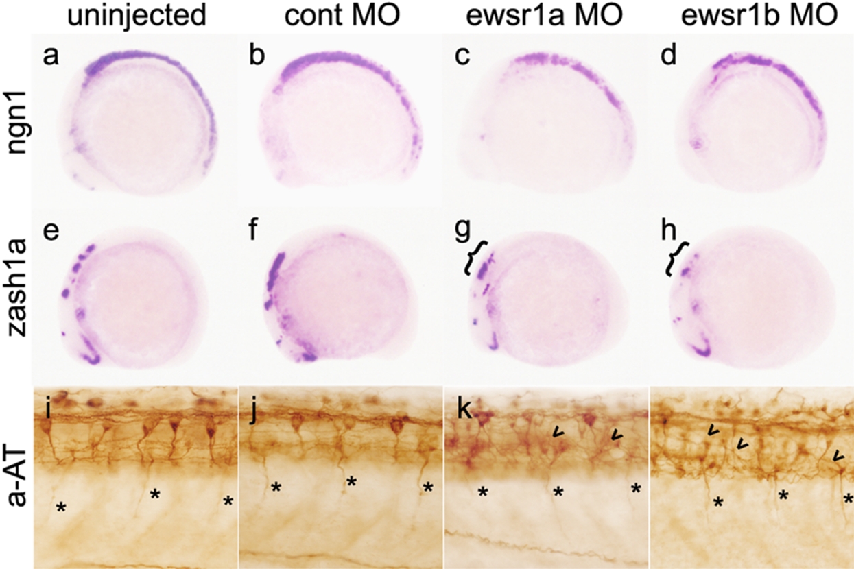 Fig. 4 ewsr1 MO Injected Embryos Display a Reduction of CNS Neuronal cells and Disorganized Neuronal Network. (a, e and i) uninjected, (b, f and j) control MO, (c, g and k) ewsr1a MO and (d, h and l) ewsr1b MO injected embryo. (a–d) ewsr1a and ewr1b MO injected 12 somite embryos show marked reduction of ngn1 expression in the CNS (lateral view). (e–h) ewsr1a and ewr1b MO injected 12 somite embryos show marked reduction of zash1a expression in the CNS (lateral view). ({) indicate marked reduction in the hindbrain of zash1a. (i–l) Lateral views of the trunk in 24hpf embryos stained with acetylated tubulin (aAT) antibody. Arrowhead identifies disorganized axonal projections in ewsr1 MO injected embryos. Asterisk (*) marks motorneurons.