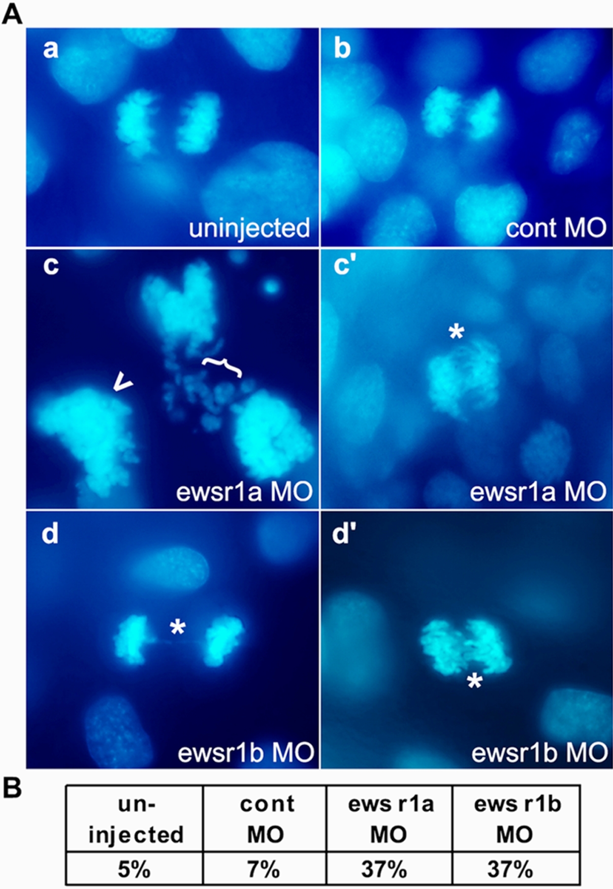 Fig. 6 ewsr1 MO Injected Zebrafish Embryos Display Genomic Instability. A. Representative images of mitotic spindles from (a) uninjected, (b) control MO, (c and c') ewsr1a MO and (d and d') ewsr1b MO injected embryo. DNA was stained with DAPI (blue). Asterisks (*) identify chromosome bridges. (c) The cell appears to be the result of aberrant chromosomal segregation. ({) points to missegregated chromosomes and arrowhead (<) to a possible additional chromosome set. B. Percentage of chromosome bridges per hundred anaphase chromosomes of uninjected, control MO, ewsr1a MO and ewsr1b MO injected embryos at the 12 somite stage (12sm).