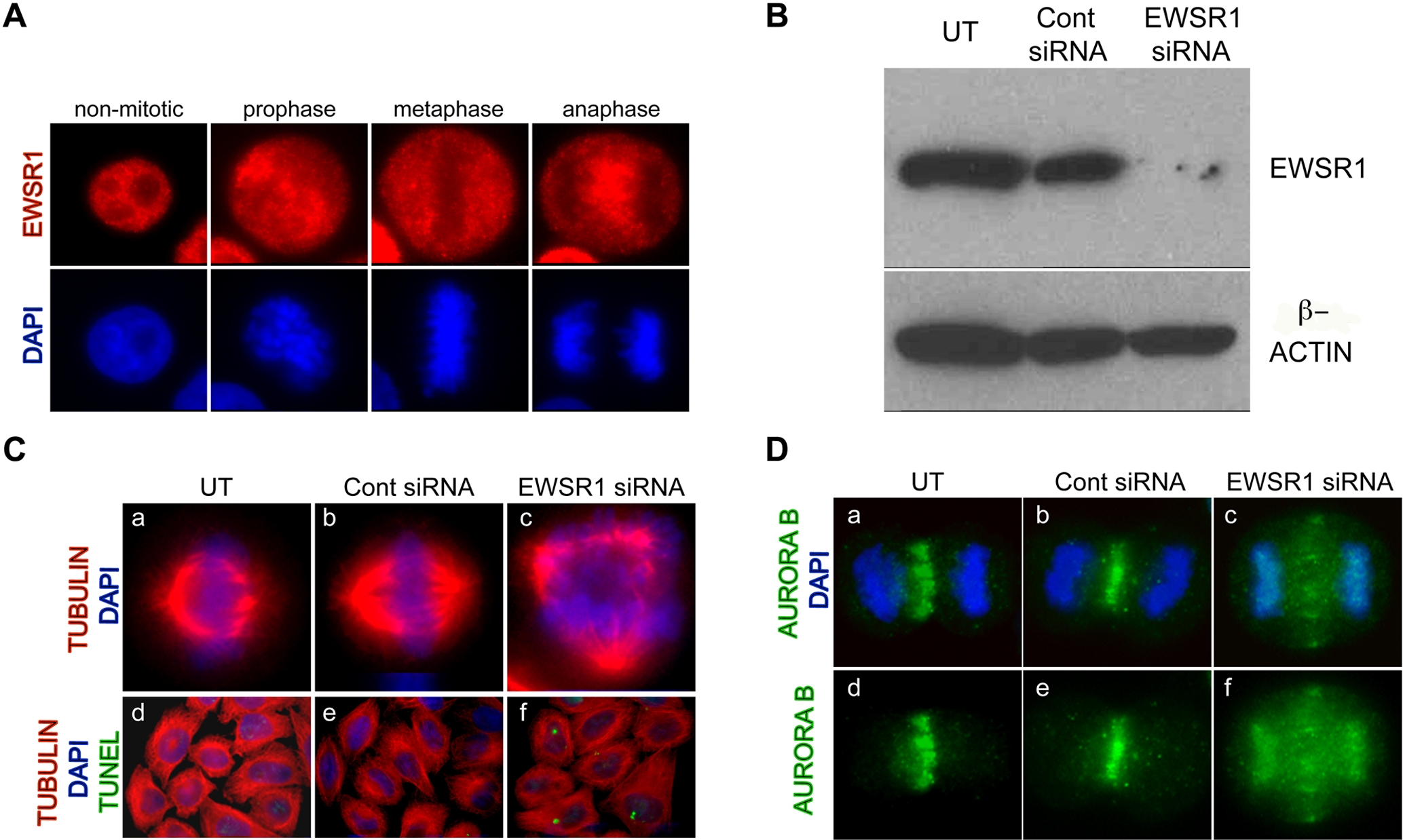 Fig. 8 EWSR1 siRNA transfected Hela cells Display Mitotic Defects. A. EWSR1 localization in Hela cells during non-mitotic and mitotic-stages. EWSR1 was visualized by anti-EWSR1 antibody (red) and DNA was stained with DAPI (blue). B. EWSR1 protein (top panel) and β-Actin (bottom panel) visualized by western blotting. C. Representative images of mitotic spindles from (a and d) UT, (b and e) Cont siRNA and (c and f) EWSR1 siRNA transfected Hela cells. DNA was stained with DAPI (blue), the spindles were visualized by α-Tubulin (red) and the apoptotic cells were visualized by TUNEL assay (green). D. Representative images of Aurora B (green) with DNA (blue) (a–c), and Aurora B (green) without DNA (d–f). (a and d) UT, (b and e) Cont siRNA and (c and f) EWSR1 siRNA transfected Hela cells. UT: untransfected, Cont siRNA: control siRNA transfected, EWSR1 siRNA: EWSR1 siRNA transfected Hela cells.