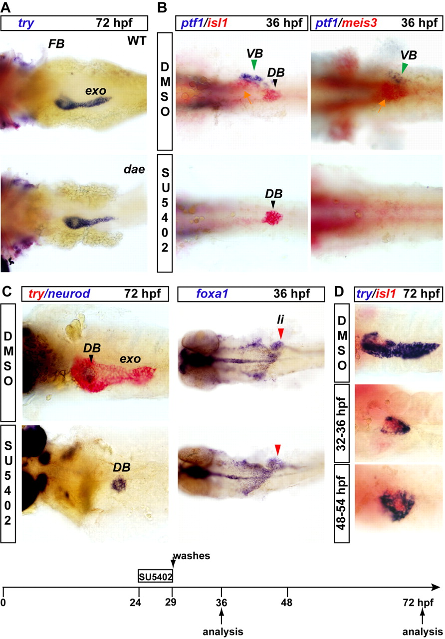 Fig. 3 Inhibition of FGF signaling, but not Fgf10, impairs specification of the ventral pancreatic bud and the expression of isl1 and meis3 in the adjacent pancreatic LPM. (A) trypsin (try) expression analysis in wild-type embryos (WT, top) and in fgf10-/- mutants (dae, bottom) at 72 hpf. Note the underdeveloped pectoral fin bud in the dae mutant. (B) Expression of ptf1a (blue), isl1 and meis3 (red) at 36 hpf in embryos treated with the FGF signaling inhibitor SU5402 from 24 to 29 hpf. (C) Expression of trypsin (red) and neurod (blue) at 72 hpf after the same treatment as in B and analysis of the endodermal marker foxa1 at 36 hpf upon SU5402 treatment. Note that the liver and the rest of the endoderm are clearly labeled whereas, at this stage, the pancreas is almost undetectable. The SU5402 treatment analyzed in B and C is schematized at the bottom of the panel. (D) trypsin (blue) and isl1 (red) expression at 72 hpf in embryos exposed to SU5402 from 32 to 36 hpf and from 48 to 54 hpf. The green arrowhead indicates the ventral pancreatic bud (VB); the black arrowhead indicates the dorsal bud (DB); and the yellow arrow indicates the pancreatic LPM adjacent to the ventral bud. exo, exocrine tissue; li, liver; FB, pectoral fin bud.