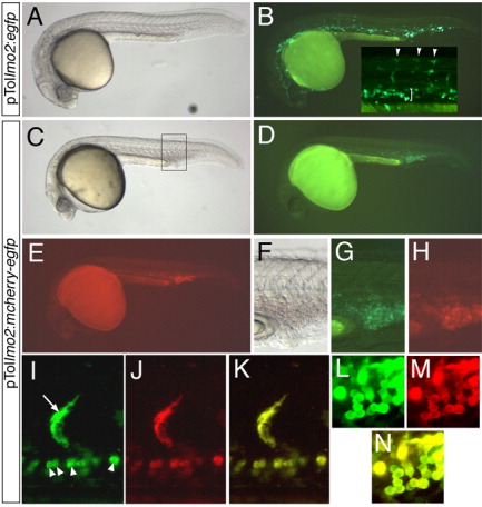 Fig. 6 Validation of pTollmo2-Dest vectors. A-N: Injected embryos at 28 hours postfertilization, lateral views, dorsal is up, anterior to the left. A,B: Embryo injected with 25 pg of pTollmo2:egfp and 25 pg of transposase mRNA. A: Transmitted light image. B: Fluorescent image of embryo in A to visualize enhanced green fluorescent protein (Egfp) expression. Inset, higher magnification of trunk region, indicating Egfp expression in numerous segmental arteries (arrowheads) and intermediate cell mass (bracket). C-N: Embryos injected with 25 pg of pTollmo2:mcherry-egfp and 25 pg of transposase mRNA. C,F: Transmitted light image. D,G: Epifluorescence image to visualize Egfp expression. E,H: Epifluorescence image to visualize mCherry expression. F-H: Higher magnification view of caudal vein expression from embryo in C (box). I-N: Confocal micrographs; embryo is different than the one pictured in C. I: Green fluorescence of mCherry-Egfp in a segmental artery (arrow) and red blood cells (arrowheads). J: Red fluorescence of mCherry-Egfp. K: Overlay of green and red fluorescence from images in I and J. L: Green fluorescence of mCherry-Egfp in blood cells. M: Red fluorescence of mCherry-Egfp in blood cells. N: Overlay of green and red fluorescence from images in L and M.