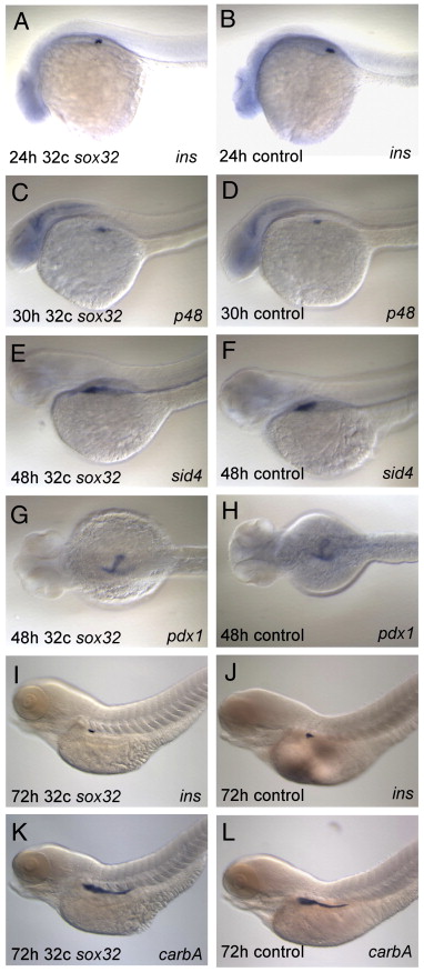 Fig. S1 sox32 mRNA does not perturb normal endoderm development. A single cell was injected with sox32 mRNA and rhodamine dextran at the 32-cell stage as outlined in Materials and methods (A, C, E, G, I, K), or left uninjected (B, D, F, H, J, L). Embryos were fixed and assayed for expression of insulin at 24 hpf (A, B), p48 at 30 hpf (C, D), sid4 at 48 hpf (E, F), pdx1 at 48 hpf (G, H), insulin at 72 hpf (I, J) and carbA at 72 hpf (K, L) by whole mount in situ hybridization. All embryos are in lateral view with anterior to the left.