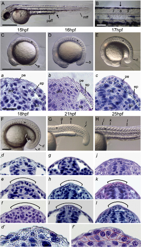 Fig. 1 (A, B) Overview of the median fin fold in a 42 hpf zebrafish embryo from the lateral view (A) and higher magnification of anterior trunk region (B). The continuous midline fin fold (mff, median fin fold (MFF)) surrounds the tail and trunk region from the cloaca (arrow in panel A) to the rostral edge at the 8th somite level (arrow in panel B). paff, pre-anal fin fold; y, yolk; ye, yolk extension. Numbers indicate the somite number. (C–H, a–l) Histological analysis of median fin fold. (C–H) 15–24 hpf zebrafish embryos from the lateral view. (a–l) HE staining of transverse sections at the level of each bar in panels C–H. At 15 hpf (C, a) and 16 hpf (D, b), the presumptive fin fold epidermis (indicated by the black broken lines in a and b that are under the epidermal cell layer) was still connected to the neural ectoderm in the tail bud. (E, c) Epidermis covered the midline of the tail and trunk at 17 hpf (indicated by the black broken lines in c). ep, epidermis; nc, notochord; nt, neural tube; pe, peridermis; pnt, prospective neural tube; so, somite. (F) At 18 hpf, wedge-shaped epidermal cells were distinguishable at the midline of the tail bud (e, f; indicated by brackets), but these cells were not observed at a more rostral region (d). (G, H) Then the area in which wedge-shaped cells were seen (h, i for 21 hpf, and k, l for 25 hpf; indicated by brackets) expanded rostrally and caudally as the tail elongated. The dots indicate the final position of the anterior boundary of the fin fold (8th somite level). (j2, f2) High magnifications of j and f. Typical cuboidal-shaped epidermal cells and wedge-shaped epidermal cells indicated by the blue (in j2) and red (in f2) broken lines, respectively. Scale bars in panels A–C, F, and (a) are 500 μm, 100 μm, 500 μm, 200 μm, and 50 μm, respectively. The panel width of (d–l) is 100 μm.