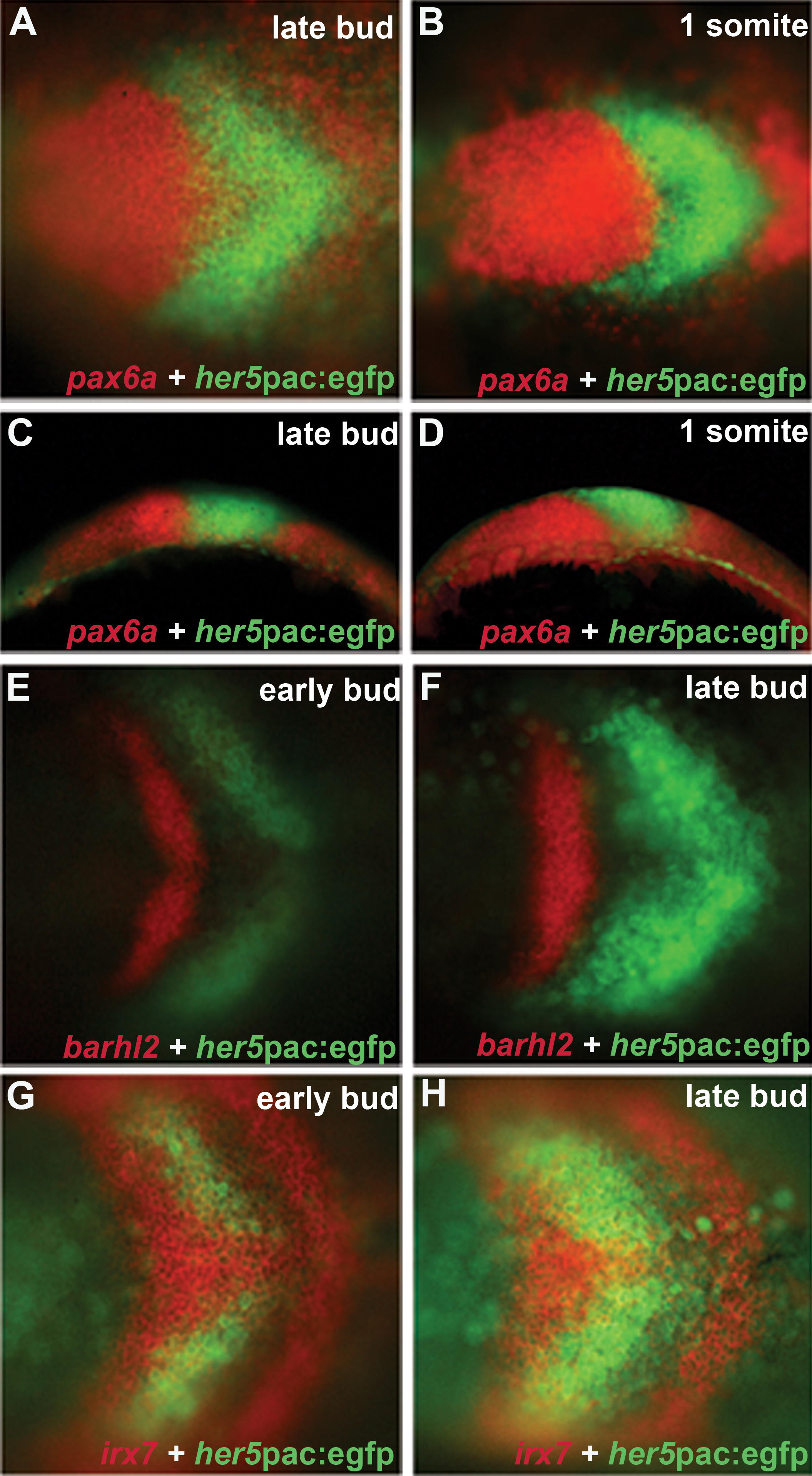 Fig. 2 GFP Transgenic Lines Provide Good Landmarks in the Neural Plate (A–D) pax6a (red) and her5pac:egfp (green) are expressed in adjacent neural plate territories at bud stage (A and C) and 1-somite stage (B and D); The same embryos are shown in dorsal (A and B) and lateral views (C and D), rostral to the left. (C and D) show dynamic changes in the neural plate positioning the rostral midbrain dorsal to the caudal diencephalon; (E and F) Dorsal views, rostral to the left of neural plates showing barhl2 (red) and her5pac:egfp (green) expression revealing a shape change of the rostral diencephalon from a mild V-shape (E) at early bud stage to a straight line (F) at late bud stage; (G and H) Dorsal views, rostral to the left of neural plates showing irx7 (red) + her5pac:egfp (green) expression, visualizing the domain of the caudal diencephalon anterior to the midbrain at early bud stage (G) and late bud stage (H).
