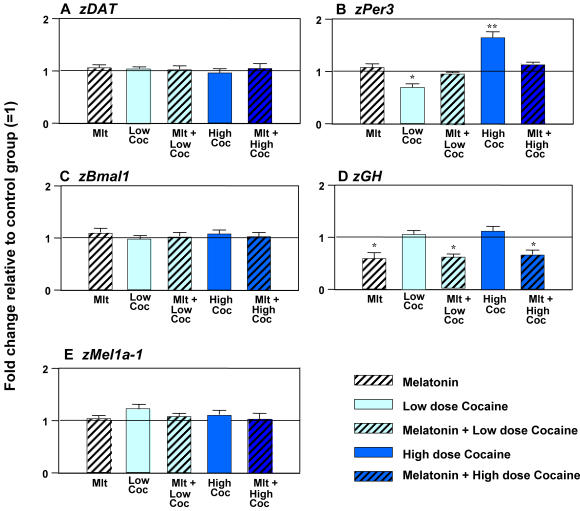 Fig. 3 Nighttime low- or high-dose cocaine exposure fails to alter the expression of zDAT, zBmal1, zGH and melatonin receptor genes during zebrafish development but continues to affect zPer3, and this effect is counteracted by melatonin. (A–E) Melatonin (100 nM for 45 min), Low (0.3 μM) or High (30 μM) cocaine doses (15 min), with or without melatonin pre-treatment (100 nM, 30 min) administered to 36-hpf embryos. N=3–4 samples/treatment group, 25 embryos per sample. Mean±SEM, t-test (vs. control), * p<0.05, ** p<0.01, *** p<0.001; One way ANOVA (between treatments), a: p<0.05, vs. cocaine-only group. Mlt-melatonin; Coc-cocaine.