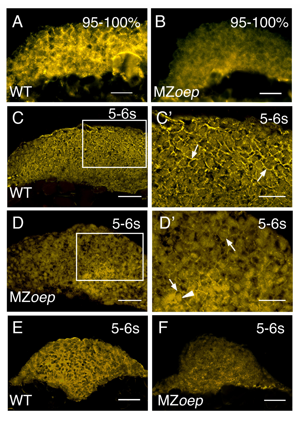 Fig. 5 N-cad expression in the anterior neural keel is altered in MZoep mutants. (A-F) N-cad immunostaining of tissue sections from WT and MZoep embryos. (A, B) Sagittal sections though the anterior neural keel with anterior to the left and dorsal to the top. (C-D') Parasagittal sections with anterior to the left and dorsal to the top. Panels C' and D' are higher magnifications of the boxed regions in panels C and D, respectively. Arrows point to N-cad labeling in the cell membrane, while the arrowhead indicates labeling in the cytoplasm. (E, F) Transverse sections through the anterior neural tube, dorsal to the top. n e 30 embryos for each sample. Embryos are at 95–100% epiboly (95–100%) or the 5–6 somite stage (5–6 s). Scale bars: 40 μm (C, D, E, F), 20 μm (A, B, C', D').