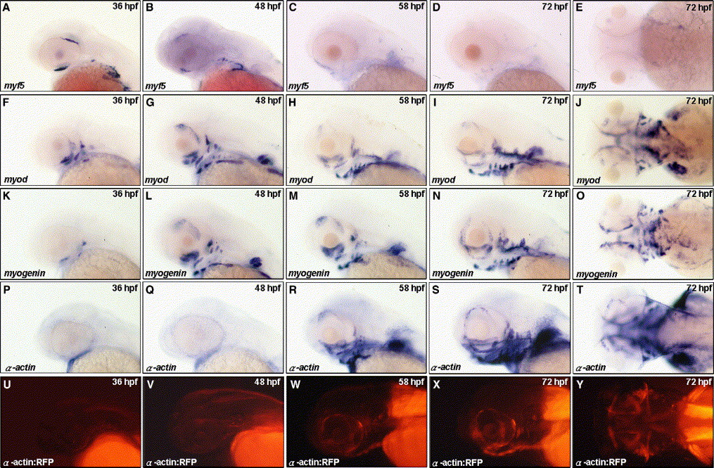 Reprinted from Developmental Biology, 299(2), Lin, C.Y., Yung, R.F., Lee, H.C., Chen, W.T., Chen, Y.H., and Tsai, H.J., Myogenic regulatory factors Myf5 and Myod function distinctly during craniofacial myogenesis of zebrafish, 594-608, Copyright (2006) with permission from Elsevier. Full text @ Dev. Biol.