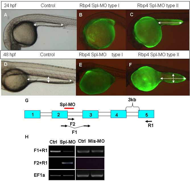Fig. 3 Effects of Rbp4 splicing MO on morphology of embryos. Rbp4 Spl-MO was injected into the blastoderm margin area at 4 hpf with Fluorescein and injected embryos were photographed at 24 hpf and 48 hpf. (A, D) Control embryos at 24 hpf and 48 hpf. (B, E) Fluorescent lateral view image of type I phenotype (without yolk cell extension) morphants at 24 hpf (B) and 48 hpf (E). (C, F) fluorescent lateral view image of type II phenotype (short yolk cell extension) morphants at 24 hpf (C) and 48 hpf (F). White double arrows indicate the length and width of yolk extension. (G) Scheme of splicing morpholino and RT-PCR primer positions in the rbp4 gene. Exons are represented by blue boxes with numbers and introns by white boxes. A red bar indicates the region targeted by Rbp4 Spl-MO. (H) RT-PCR analysis of RNAs from control (Ctrl) (non-injection)/splcing morphlino injected embryos (Spl-MO) and control (Ctrl) (non-injection)/mismatch morpholino injected embryos (Mis-MO) at 24 hpf using the rbp4 primers as indicated in Panel (G) or EF1a control primers.