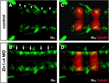 Fig. S3 Zic1 and Zic4-deficient embryos lack normal segmental patterns of neuronal differentiation in the hindbrain. (A,B) Longitudinal confocal sections through the dorsal hindbrain of Hu immunolabeling (green, labels post-mitotic neurons), and (C,D) of double labeling with antibodies to Hu (green) and EphA4 (red, labels r3 and r5). In 24 hpf control embryos (A,C) post-mitotic neurons are clustered in the center of rhombomeres and absent from rhombomere boundaries (white arrowheads in A), while in Zic1 + 4 morphants (B,D) segmental pattern of Hu labeling is disrupted with ectopic differentiation of Hu-positive neurons in boundary regions (white arrows in B).