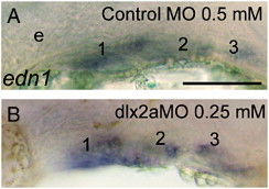 Fig. S1 Expression of the edn1 in 24 hpf embryos that were injected with (B) 0.25 mM dlx2aMO embryos is similar to that of embryos that received the control MO (0.5 mM). Anterior is to the left. e, eye. Scale bar: 100 μm.