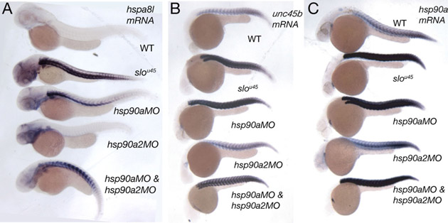 Fig. S8 hsp90a morphants show upregulation of chaperone transcripts whereas hsp90a2 morphants do not. Lateral views of wild-type, slou45, hsp90a morphant, hsp90a2 morphant and hsp90a/hsp90a2 double morphants (condition indicated above individual embryos) examined for expression of hspa81 (A), unc45b (B) and hsp90a (C). Abrogation of hsp90a2 activity had little effect on gene expression. The bent body of the hsp90a2 morphants might not be a specific phenotype as an alternative hsp90a2 MO produced embryos with normal morphology (see Materials and methods).