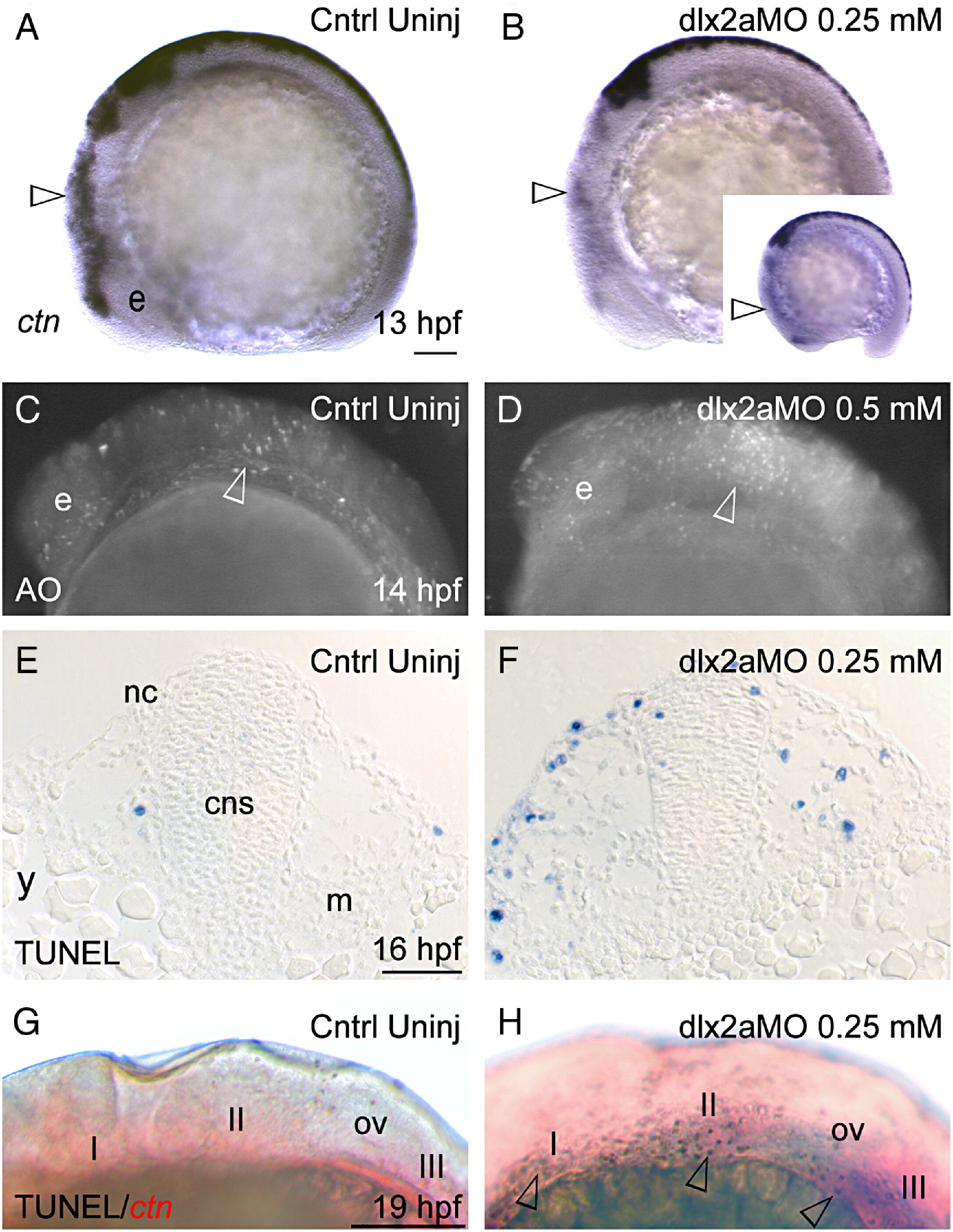 Fig. 3 dlx2a is necessary for survival of a subset of neural crest cells migrating to the pharyngeal arches. Crestin expression at 13 hpf in (A) Control (un-injected) embryo compared with, (B) an embryo injected with dlx2aMO, 0.25 mM. (B, inset) crestin expression at 15 hpf in dlx2aMO-injected embryo (0.25 mM). (C, D) Acridine orange staining of (C) control un-injected and (D) dlx2aMO-injected (0.5 mM) embryos at 14 hpf. (E, F) TUNEL-labeled transverse sections of a control (un-injected) 16 hpf embryo and an embryo injected with 0.25 mM dlx2aMO, (G, H) TUNEL labeling (black) and crestin (red) whole-mount in situ hybridization at 19 hpf. (G) Control (un-injected) embryo compared with (H) dlx2aMO injected embryo, 0.25 mM. Arrowheads in panels A and B indicate reductions of rostral crestin expression. Arrowheads in panels C, D, H indicate sites of cell death. (G, H) crestin labeled neural crest streams are labeled with Roman numerals. Anterior is to the left. cns, central nervous system; e, eye; m, mesoderm; nc, neural crest; ov otic vesicle; y, yolk. Scale bar: (A, G) 100 μm, (E) 50 μm.