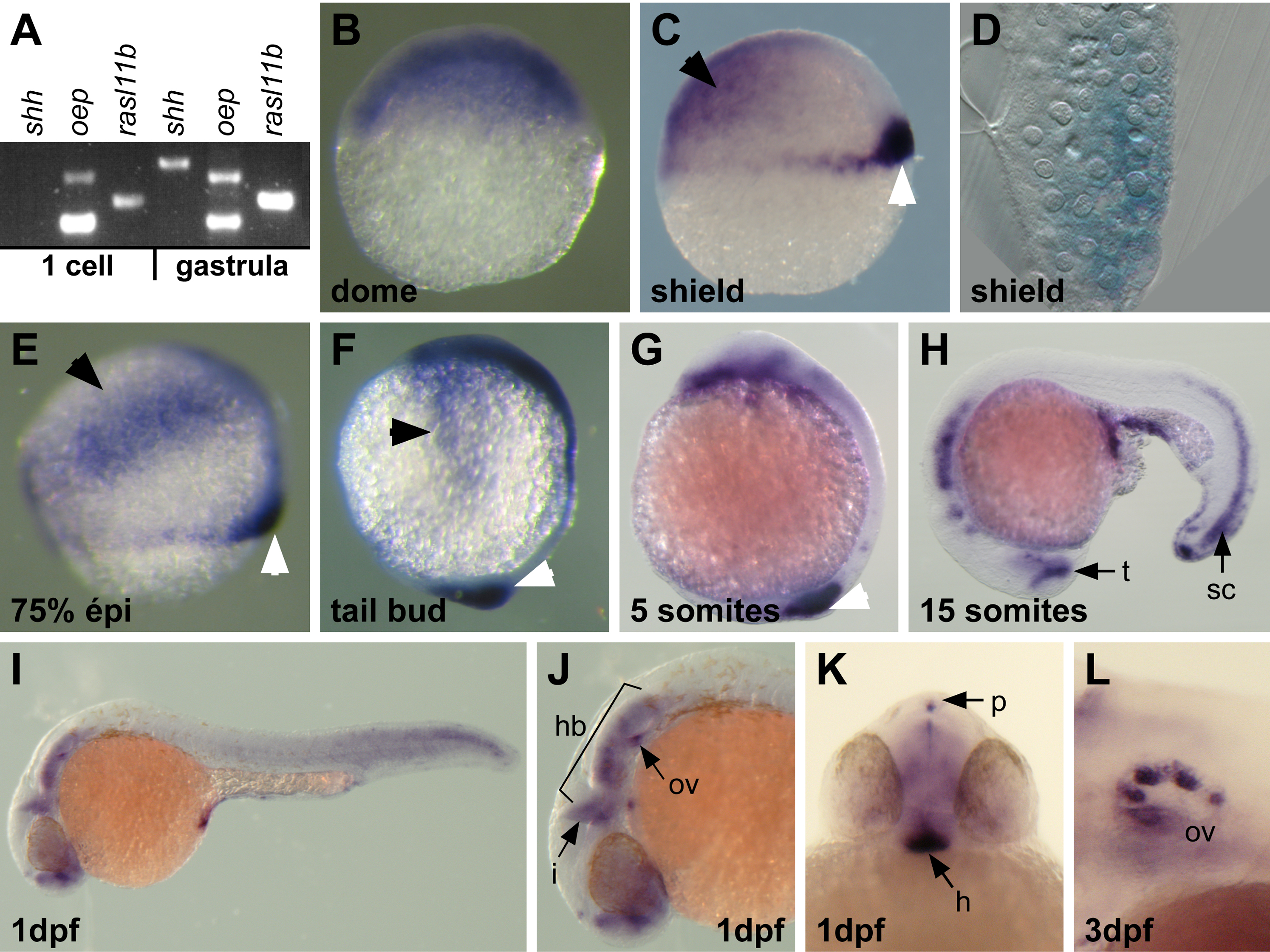 Fig. 2 rasl11b expression pattern during zebrafish embryogenesis.(A) RT-PCR analysis showing that rasl11b has a maternal and a zygotic component. RNA extractions have been done before (1 cell stage) and after (gastrula) the midblastula transition, the time of activation of the zygotic transcription. The maternally and zygotically expressed oep gene and the strictly zygotic sonic hedgehog (shh) gene have been used as controls. (B) During the cleavage period (dome stage), rasl11b is ubiquitously expressed. (C) At the onset of gastrulation (shield stage), rasl11b is still detected at the animal pole (Black arrowhead) but is also expressed in a dorso-ventral gradient at the dorsal margin (white arrowhead). This marginal expression overlaps with the mesendodermal territory in zebrafish embryos. (D) Sagittal section. rasl11b transcript accumulates in both hypoblastic and epiblastic dorsal blastomeres. (E, F) rasl11b expression is maintained at the margin throughout gastrulation (white arrowheads). Gastrulae also expressed n. rasl11b transcript accumulates in both hypoblastic and epiblastic dorsal blastomeres. (E, F) rasl11b exprerasl11b mRNA in ectodermal precursors located at the lateral borders of the blastoderm (black arrowheads). (G–K) During somitogenesis and organogenesis, rasl11b is expressed in the tail tip and the spinal cord (sc), and in several head structures such as the hindbrain (hb), the isthmic organizer (i), the otic vesicle (ov), the pineal gland (p), the ventral hypothalamus (h) and the posterior boundary of the telencephalon (t). (J) lateral close up and (K) frontal v