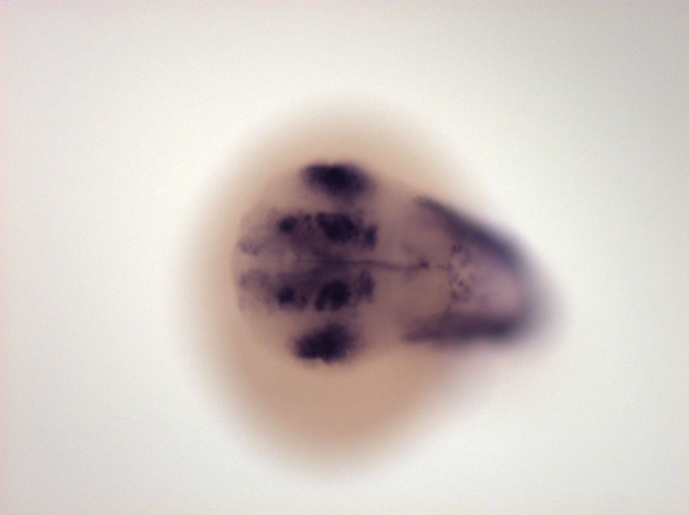 Fig. 5 median fin fold, AER pectoral fin, dorsal part of retina (more in lens), dorsal otic vesicle, dorsal hindbrain, dorsal midline midbrain, tegmentum, nucleus in diencephalon.