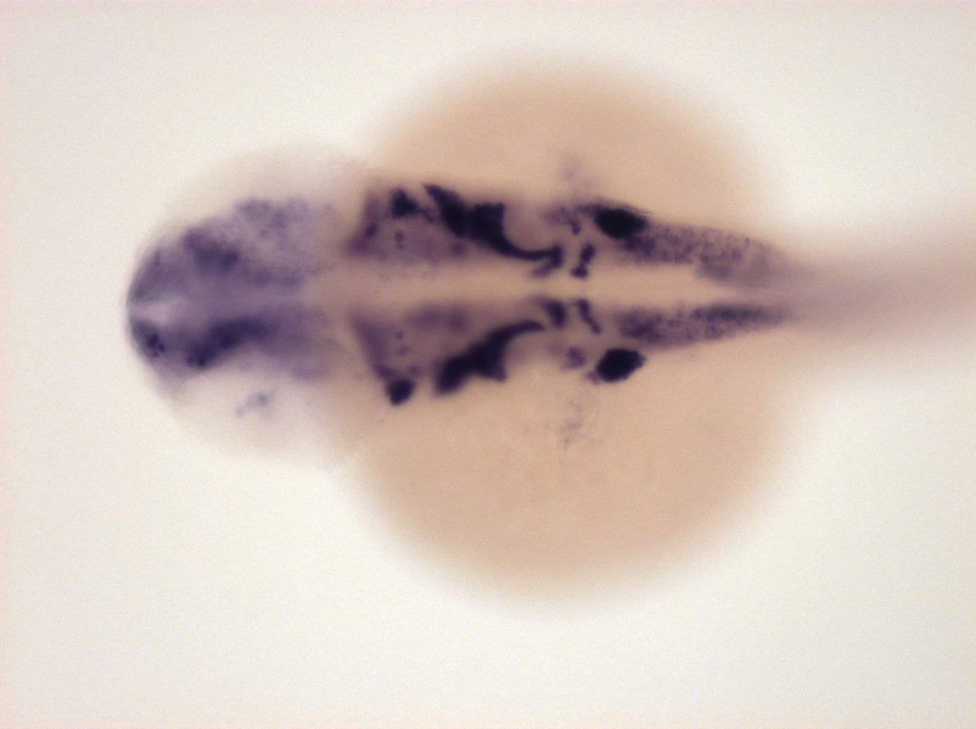 Fig. 5 cranial ganglia, branchiomotor neurons, neurons in ventral lateral hindbrain and spinal chord, weak in intersegmental blood vessels, caudal dorsal spinal chord neurons, neurons in presumptive habenula (less in left), telencephalon, diencephalon (weaker) (no labeling in intersegmental blood vessels), midbrain, hindbrain non ventricular, cells anterior to the lens in ganglion cell layer