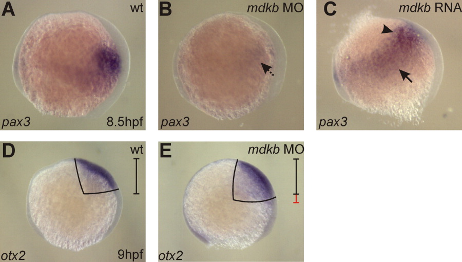 Fig. 4 mdkb regulates early pax3 expression. A: Lateral view of pax3 expression in a control embryo at 80% epiboly (dorsal to the right). B: Reduced pax3 expression in embryo co-injected with mdkb Up and Down splice-site Morpholinos (MOs). The arrow marks an area with reduced pax3 expression. C: Expanded pax3 expression in an embryo injected with 150 pg of mdkb mRNA. The arrow marks a region of expanded pax3 expression, the arrowhead the anterior border of pax3 expression. D,E: otx2 expression in the anterior neural plate of control (D) and mdkb MO-injected embryos (E) at 90% epiboly. Note that the otx2 region is slightly expanded, suggesting that neural plate is not reduced in mdkb morphants.