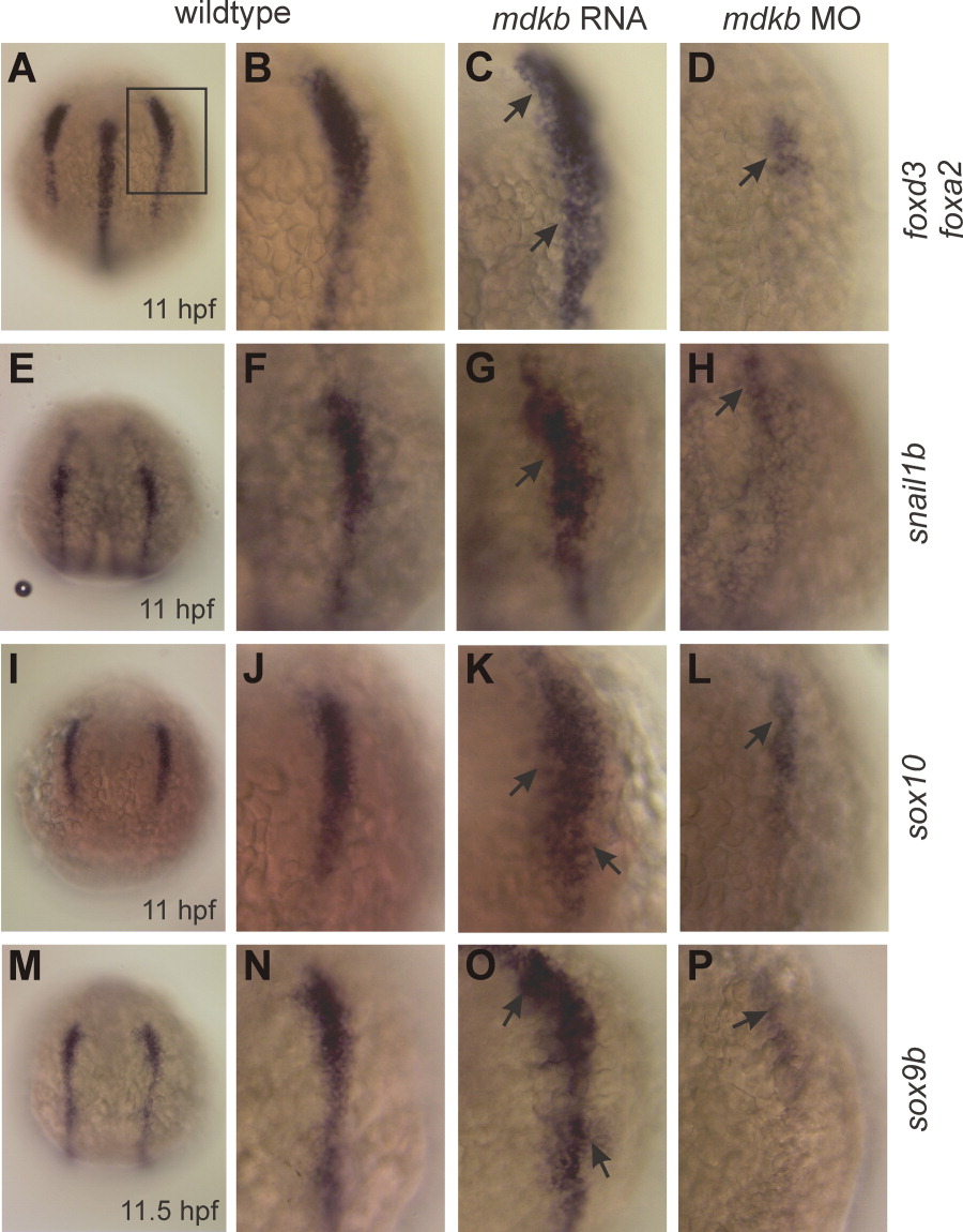 Fig. 5 mdkb regulates formation of different subtypes of neural crest cells. A-P: Expression of foxd3/foxa2 (A-D), snail1b (E-H), sox10 (I-L), and sox9b (M-P) in noninjected wild-type embryos (first and second column), embryos injected with 150 pg of mdkb mRNA (third column) and mdkb splice-site Morpholinos (forth column). A, E, I, and M are dorsal views of whole embryos with anterior to the top, all other pictures are higher magnification views of corresponding regions marked by box in A. Arrows indicate areas of enhanced and reduced, respectively, expression.