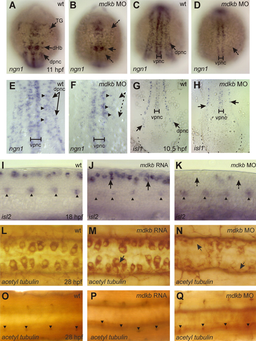 Fig. 6 mdkb regulates formation of sensory neurons. A-H: Dorsal views of trunk regions in noninjected (A,C,E,G) and mdkb Morpholino (MO) -injected embryos (B,D,F,H) at the one- to three-somite stage showing ngn1 (A-F) and isl1 (G,H) expression. Note that the embryo in H is slightly delayed due to MO injection. Dorsal proneural cells (dpnc) are reduced in injected embryos at mid-hindbrain (arrows in A,B) and trunk level (arrows in C-H), while number of ventral proneural cells (vpnc) is not affected. Note remaining interneurons (arrowheads), but absent sensory neurons (arrows) in mdkb morphants (in E,F). I-K: Lateral views of trunk regions in embryos at the 18-somite stage showing isl2 expression in ventrally located motor neurons (arrowheads) and dorsal sensory Rohon-Beard (RB) neurons (arrows). Embryos injected with 150 pg of mdkb RNA (J) show enhanced numbers of dorsal RB, while motor neurons are not affected. In contrast, RB are reduced in mdkb MO-injected embryos (K). L-Q: Dorsal views of embryos at 28 hours postfertilization (hpf) immunostained with an antibody against acetylated tubulin. L-N: Focal planes at the level of dorsal sensory neurons. O-Q: Focal planes of the same embryos at the level of ventral motor neurons. Note increased RB cell number in mdkb RNA injected embryos (arrow in M) and reduced RB cell number in mdkb MO-injected embryos (arrow in N), while number of motor neurons is not affected (arrowheads in M-O). DHb, dorsal hindbrain; TG, trigeminal ganglia; VMb, ventral midbrain.