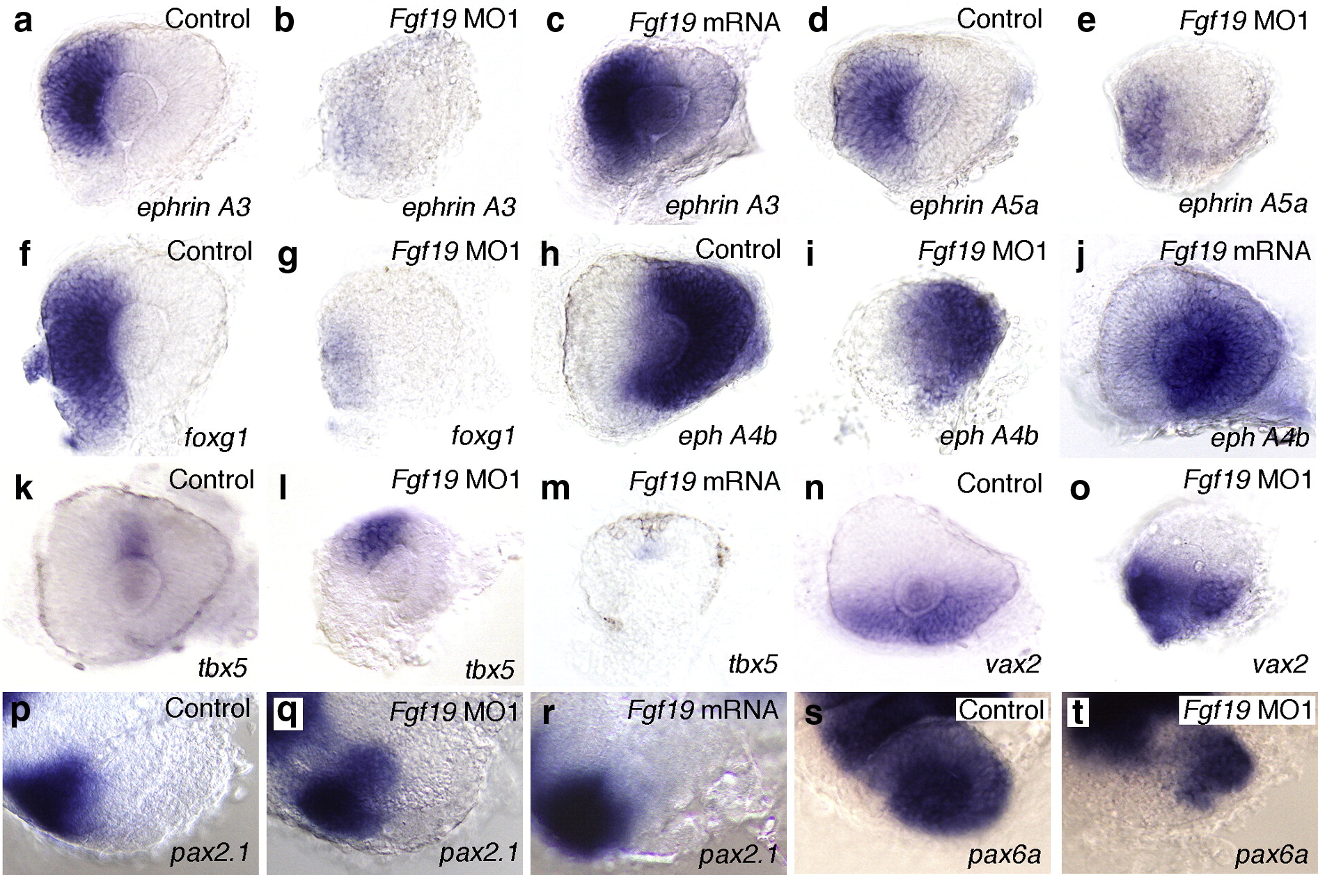 Nasal–temporal patterning of the retina in Fgf19 MO1-injected and Fgf19 mRNA-injected embryos. (a, d, f, h, k, n) Control embryos at 28 hpf. (b, e, g, i, l, o) Fgf19 MO1-injected embryos at 28 hpf. (c, j, m) Fgf19 mRNA-injected embryos at 28 hpf. (a-c) The expression of ephrin A3 was completely lost in the nasal half of the prospective retina of Fgf19 MO1-injected embryos, while the expression of ephrin A3 partially expanded into the temporal retina in Fgf19 mRNA-injected embryos. (d-g) The expression of ephrin A5a and foxg1 was severely reduced in the nasal retina of Fgf19 MO1-injected embryos. (h-j) The expression of eph A4b in the temporal half of the prospective retina partially expanded into the nasal retina in Fgf19 MO1-injected embryos, while the expression of eph A4b was decreased in the temporal retina of Fgf19 mRNA-injected embryos. (k, l) The nasal expansion of tbx5 expressetina in Fgf19 MO1-injected embryos, while the expression of eph A4b was decreased in the temporal retina of