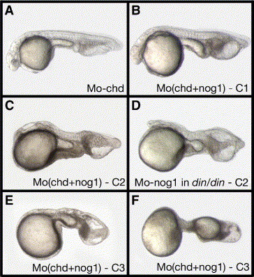 Fig. 3 Inactivation of noggin1 enhances the ventralization phenotype of chordin loss of function. (A) MO-chd-injected embryos at 30 hpf. (B–F) Injection of MO-chd together with MO-nog1 leads to (B) class 1 (C1) embryos corresponding to a weak enhancement of chd phenotype. In class 2 (C2) embryos, the ventralization phenotype following (C) injection of MO-chd and MO-nog1 or (D) injection of MO-nog1 in chordino (din/din) mutant is more pronounced than in class 1, with loss of most of the head territory. (E, F) In class 3 (C3) embryos, the ventralization after double chd-nog1 MO injection is stronger with an almost complete disappearance of anterior and dorsal territories. Lateral views, anterior to the left.