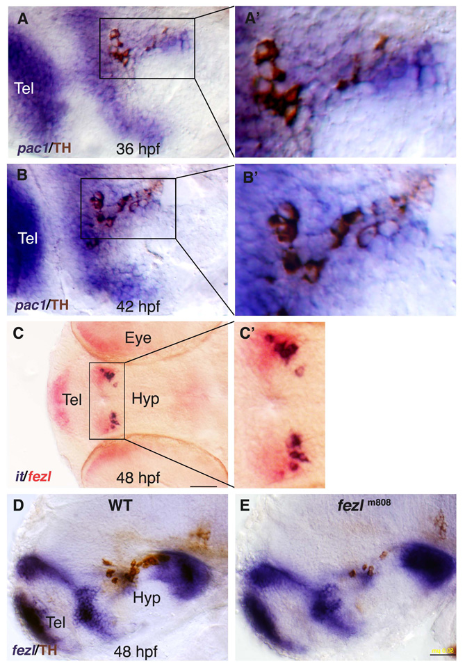 Fig. S2 In situ hybridization with pac1, isotocin (it) and fezl RNA probes. (A,B) High resolution micrographs (lateral view) of embryos which were subjected to in situ hybridization with RNA probes directed against pac1 followed by anti-TH immunohistochemistry. (C) Double in situ hybridization with RNA probes directed against isotocin (it) and fezl (ventral view). (D,E) Wild type (WT; D) and tofm808 (E) mutant with antisense fezl probe followed by anti-TH immunohistochemistry.