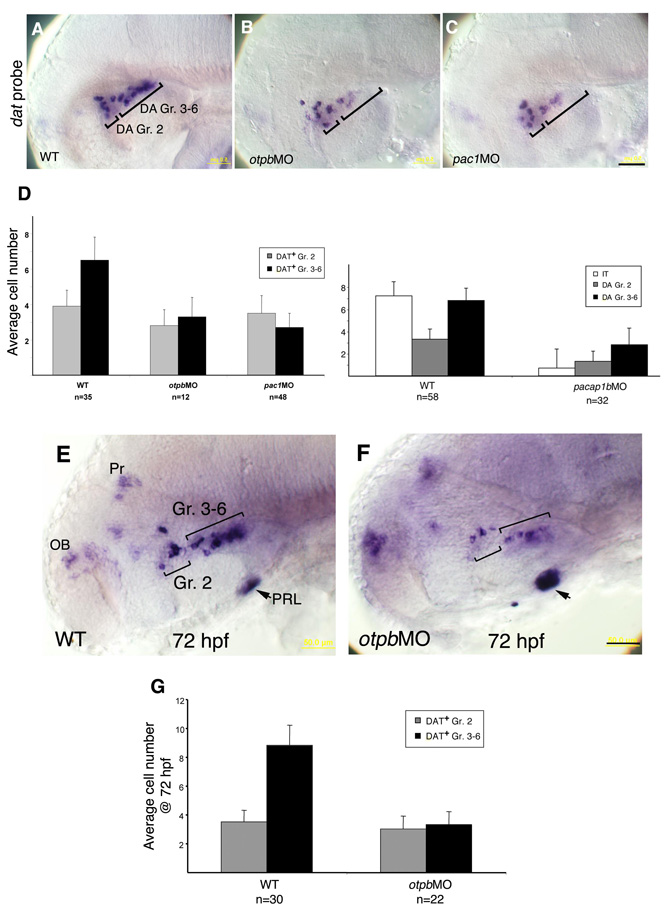 Fig. S3 Antisense morpholinos to otpb, pac1 and pacap1b affect dopamine transporter (DAT)-positive DA neurons. (a-c,E,F) Embryos were injected with either a buffer solution (WT; A,E), otpb morpholino (otpbMO; B,F) or pac1 morpholino (pac1MO; c) and were thereafter subjected to in situ hybridization with either a dopamine transporter (dat)-directed probe (A-C; at 52 hpf) or dat+prolactin (PRL)-directed probes (E,F; at 72 hpf). The two prominent clusters of dopaminergic (DA) neurons (Gr. 2 and Gr. 3-6), are indicated. (d,G) Histograms showing the effects of otpb, pac1 and pacap1b morpholinos on average cell counts of DAT+ dopaminergic (DA) and isotocinergic (IT) neurons. Bars indicate the standard deviation. The number of embryos (n) is shown below. To represent unilateral cell number (as shown in the micrographs), neurons were counted on both sides of the brain and the total number was divided by two. Scale bar: 50 μm.