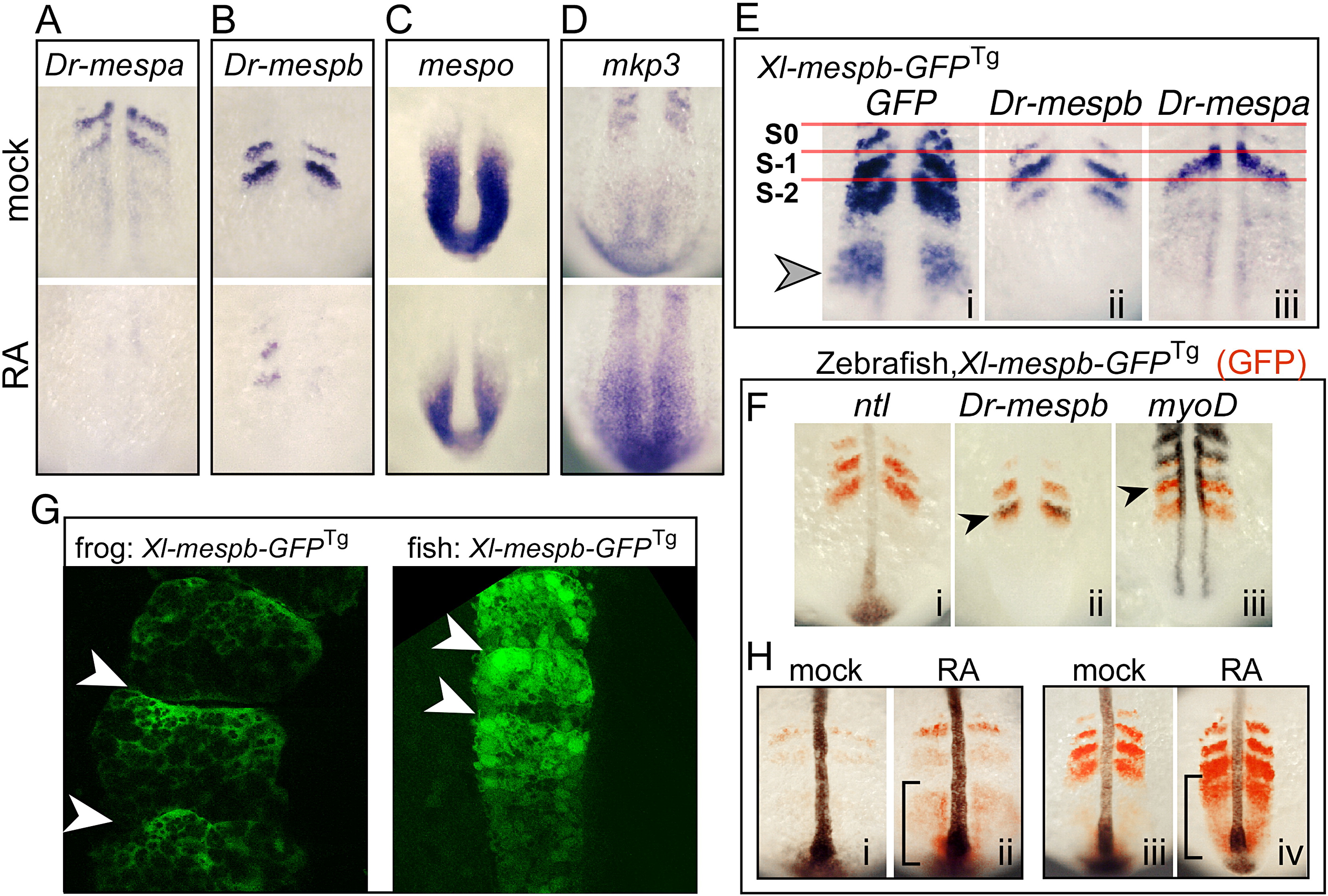 Fig. 5 Zebrafish Mesp genes respond differently to RA treatment. (A–D) Zebrafish embryos treated with carrier control (DMSO; top panels) or with RA (lower panels) for 3 h and then stained for the expression of the indicated gene: A, Dr-mespa; B, Dr-mespb; C, mespo; D, mkp3. (E) Zebrafish embryos transgenic for Xl-mespb-GFP were stained for GFP RNA (i), Dr-mespb RNA (ii) or Dr-mespa RNA expression (iii) and aligned according to the first somite. (F) Double-label in situs on zebrafish embryos transgenic for Xl-mespb-GFP with GFP (red) and the gene indicated (purple) to localize the GFP expression pattern. (G) X. laevis (left panel) and zebrafish embryos (right panel) transgenic for the full-length Xl-mespb-GFP were imaged by confocal microscopy. Shown is a region containing newly formed somites, and where somitic boundaries are marked with arrowheads. (H) Zebrafish embryos transgenic for Xl-mespb-GFP were treated with RA at the 6 somite stage (i, ii) or 12 somite stage (iii, iv) and stained for GFP RNA (red) and for no tail (ntl) in purple to mark the notochord. Brackets mark the tailbud domain. Anterior is oriented up in all panels.