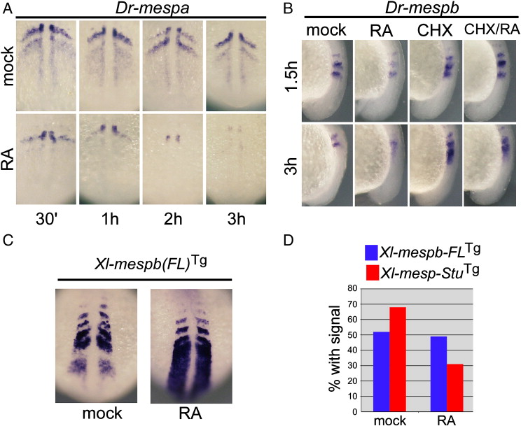 Fig. S3 (A) Zebrafish embryos either mock-treated or treated with RA for in the indicated times and then fixed and stained for Dr-mespa RNA. Shown is a dorsal view of the PSM, with anterior oriented up. (B) Zebrafish embryos were either mock-treated, treated with RA, CHX or both for the indicated times and then stained for Dr-mespb RNA. Shown is a side view of the PSM with anterior oriented up. (C) Zebrafish embryos transgenic for Xl-mespb-GFP were treated for 1 h with RA and then stained for GFP expression. The expression of Xl-mespb-GFP continues to be upregulated after longer time periods of RA treatment (data not shown). (D) The 3.5 kb Xl-mespb-GFP (FL) or the 1.7 kb Xl-mespb-GFP (Stu) transgenes were introduced into a batch of embryos. Each batch was subdivided, either mock-treated or treated with RA for 1.5 h and then fixed and stained for GFP expression in parallel. About half of the embryos prepared with Xl-mespb-GFP-FL (Blue) show transgenic expression, and this frequency does not change upon RA treatment. By contrast, the frequency of transgene expression in embryos prepared with Xl-mespb-GFP-Stu (Red) drops significantly upon RA treatment, indicating that RA is not activating but repressing expression from Xl-mespb-GFP-Stu. At least 100 embryos were scored under each experimental condition.