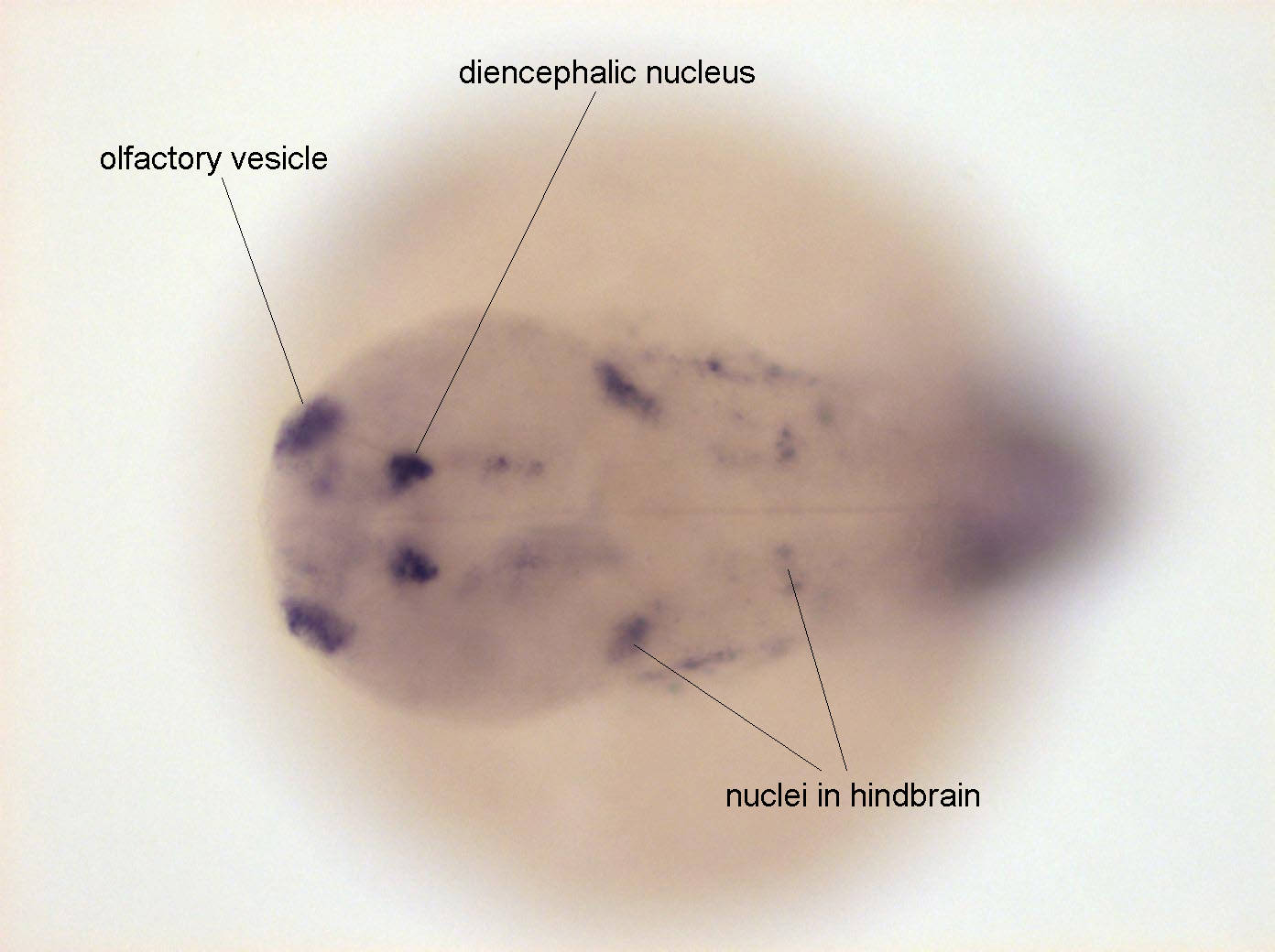 Fig. 4 Expressed in olfactory placode, epiphysis, in nucleus in diencephalon, in ventral tegmentum, in hindbrain nuclei and slow muscle fibers, in muscle pioneers, in pronephric ducts