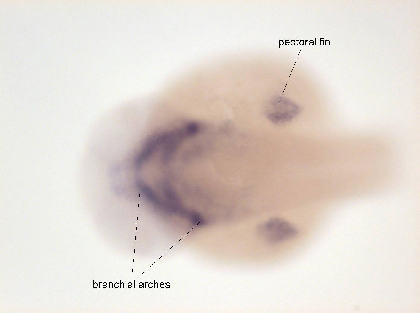 Fig. 6 Expressed in branchial arches (stronger in anterior branchial arches) and in pectoral fin cartilage.