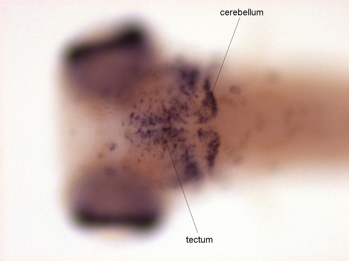 Please note that in 5 day old embryos some structures are not accessible to the probe (such as notochord, most of the trunk and tail). Therefore the description of the expression pattern is only partial.