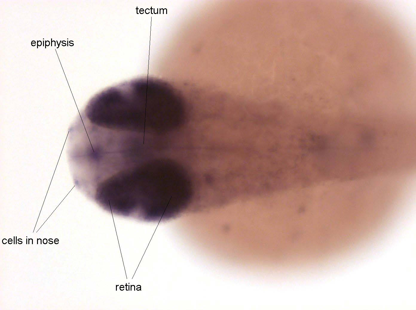 Fig. 5 Expression in hypophysis, epiphysis, retina, optic tectum, in cell in olfactory vesicle. Weak expression in gut