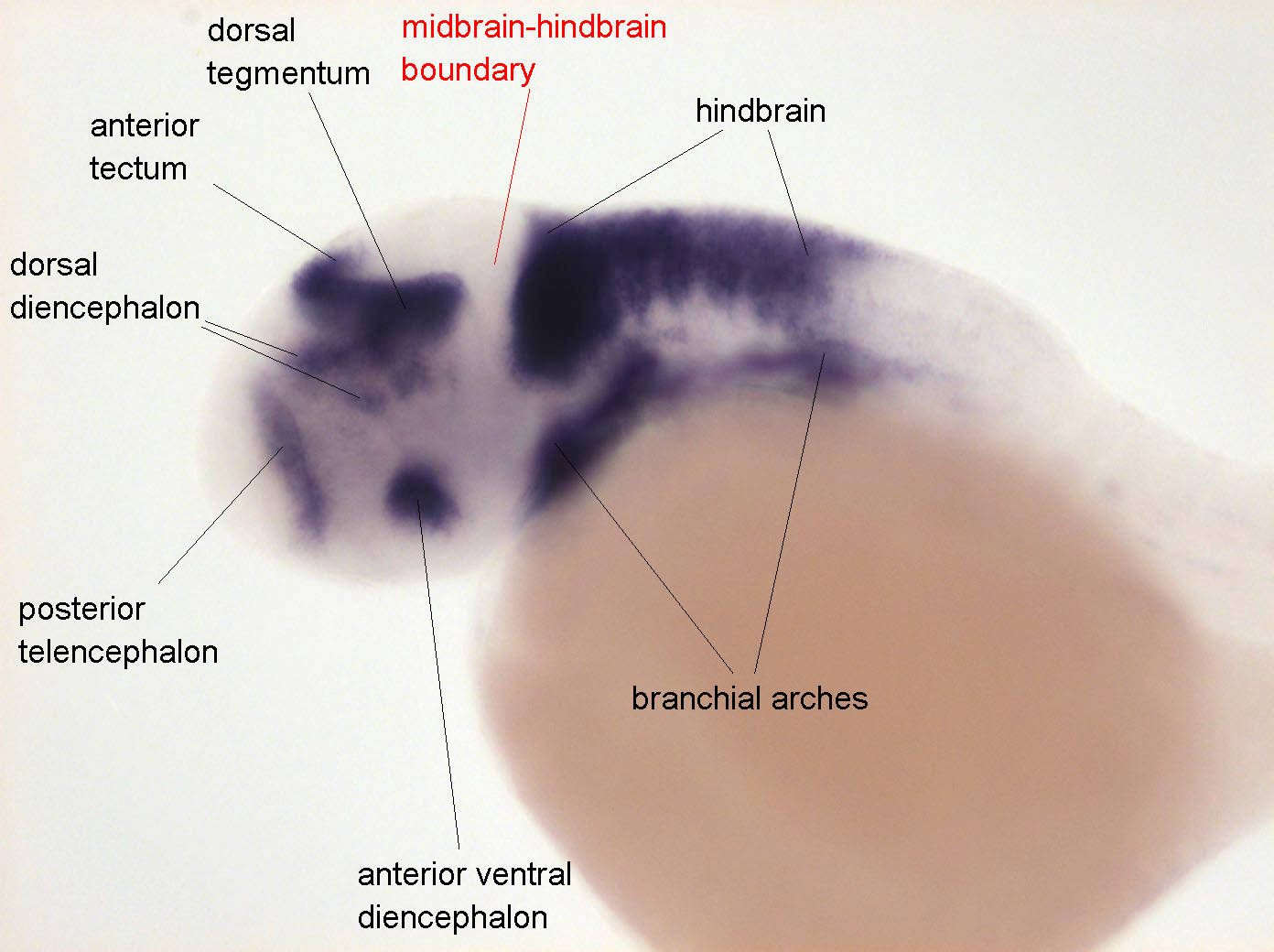 Fig. 4 Expressed in telencephalon ventricular zone, in anterior ventral diencephalon, dorsal diencephalon, anterior tectum, tegmentum, hindbrain, branchial arches