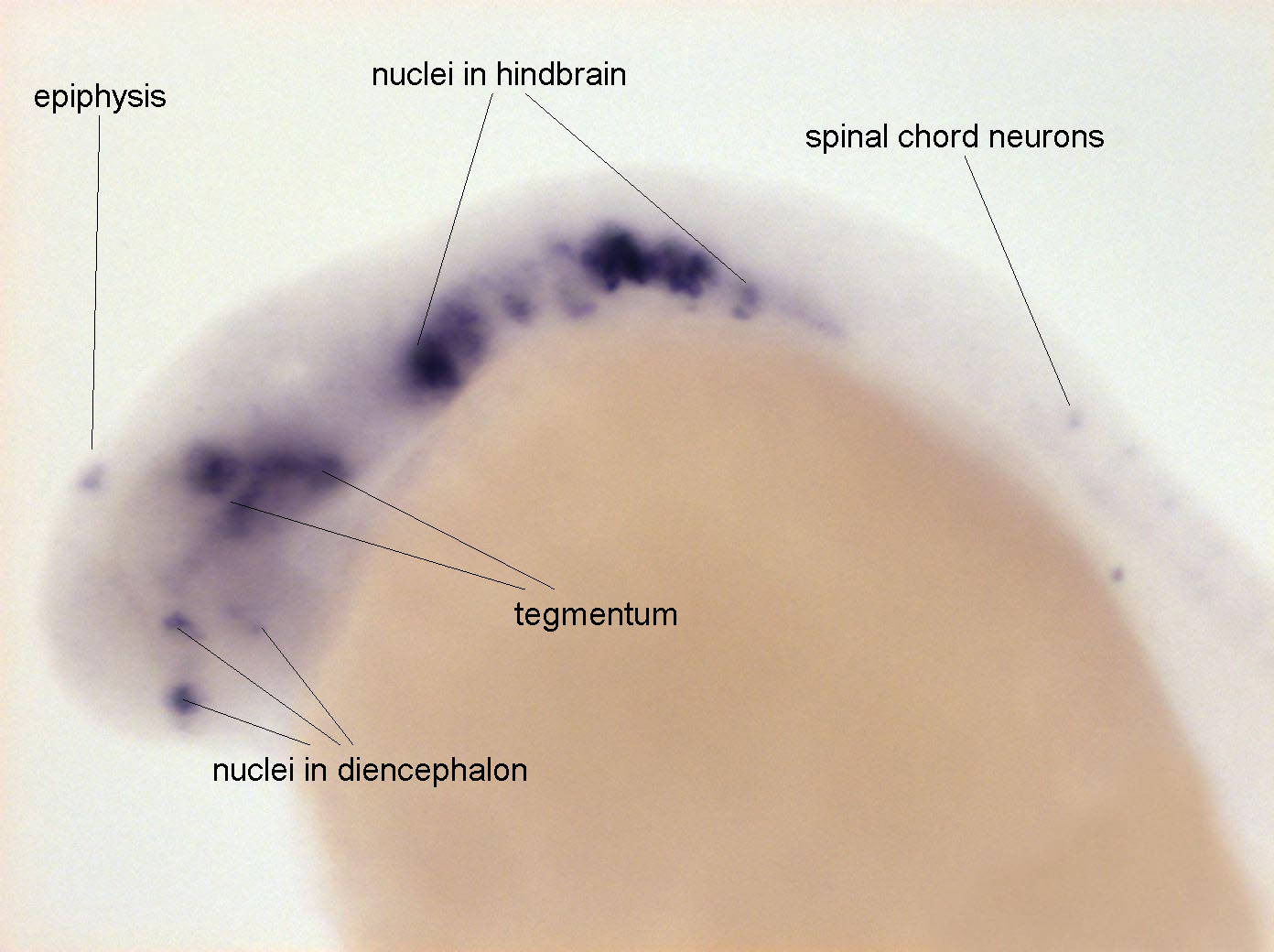 Fig. 4 Expressed in nuclei in diencephalon, tegmentum, hindbrain, in epiphysis, in spinal chord neurons and in the posterior part of the pronephric ducts