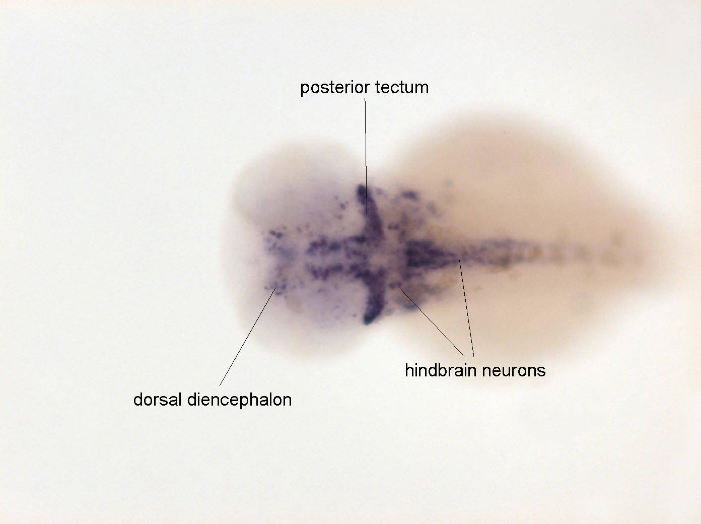 Fig. 6 Expressed in a nucleus in diencephalon, in dorsal diencephalon, in the proliferative zone of the tectum in hindbrain neurons and in spinal chord neurons
