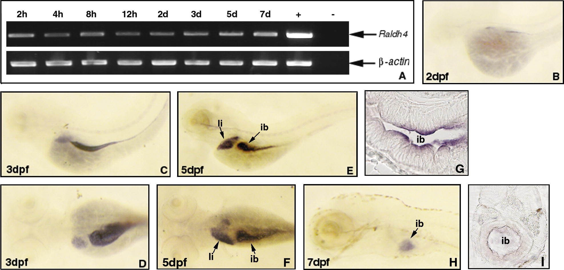 Fig. 4 Expression of raldh4 during early development of zebrafish. (A) RT-PCR analysis showing the expression of raldh4 gene. (2h–7d) Lanes using as templates total RNA isolated from 2 hpf–7 dpf embryos, respectively; +, positive control lane using raldh4 cDNA as template; -, negative control lane using water as template; PCR results give a 513 bp amplified fragment from raldh4 cDNA. Amplification of a 716 bp β-actin cDNA fragment is a control of RT-PCR sensitivity in the assay. (B-F,H) Whole mount in situ hybridization analysis showing the expression of raldh4 mRNA. (B-C,E,H) Lateral view, anterior left, dorsal top; (D,F) dorsal view, anterior left; (B) 2 dpf; (C-D) 3 dpf; (E,F) 5 dpf; (H) 7 dpf; (G) sagittal section of 5 dpf embryos through intestinal bulb; (I) transverse section of 7 dpf embryos through intestinal bulb. li, liver; ib, intestinal bulb.
