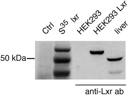 Fig. 2 In vitro translation and expression of lxr. Samples from in vitro translated 35S-methionine labeled Lxr (35S Lxr), control reaction (Ctrl), HEK293 cells transiently transfected with pCMX-lxr (HEK293 Lxr), or empty pCMX (HEK293) and liver homogenates (liver) from adult zebrafish were separated by SDS-PAGE. Proteins were detected by autoradiography or immunoblot analysis.