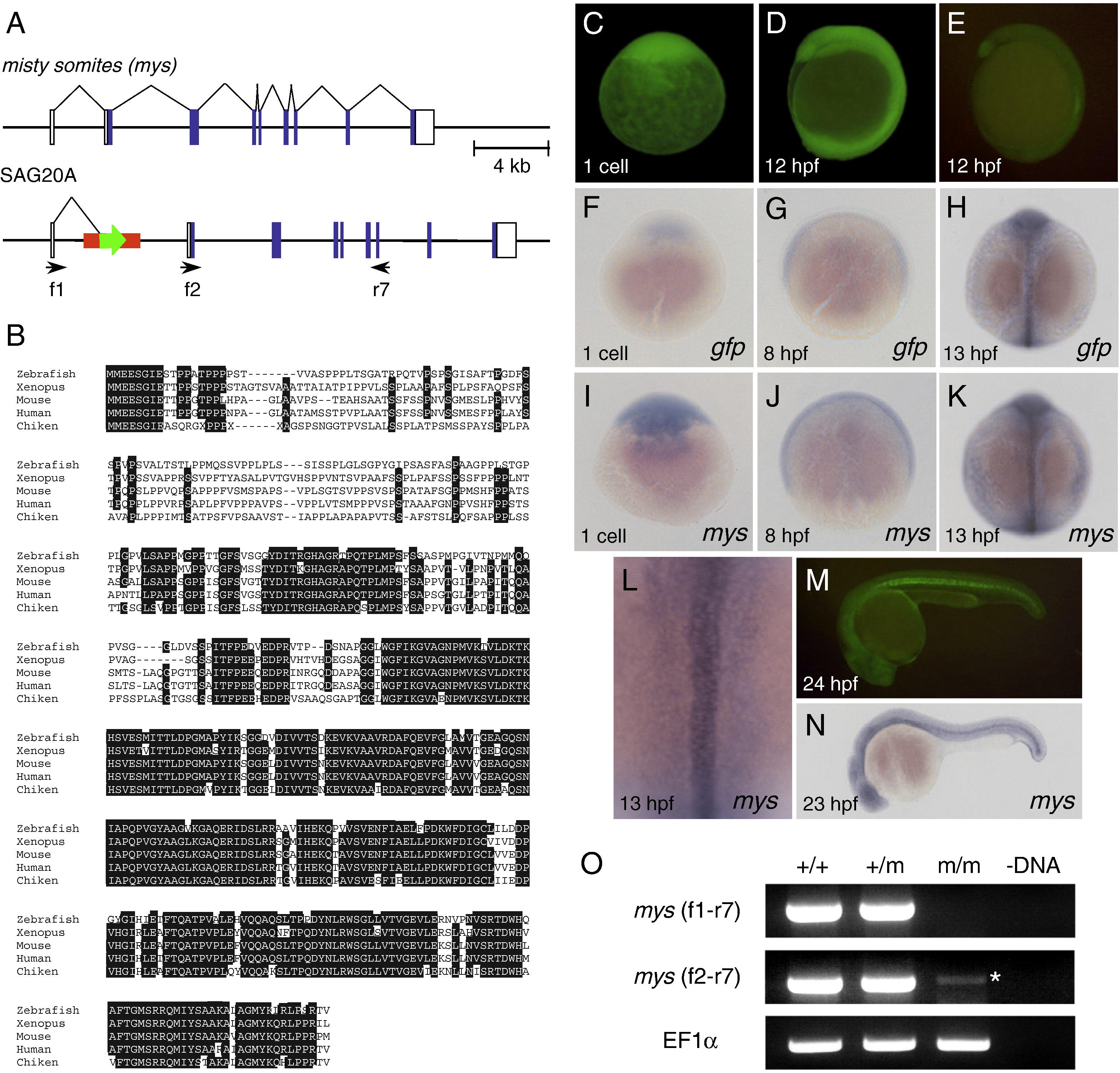 Fig. 2 Characterization of the SAG20A insertion and the mys gene. (A) The structure of the wild type misty somites (mys) locus and the SAG20A insertion. White boxes indicate untranslated regions and blue boxes indicate coding regions of the mys gene. Arrows indicate primers used for RT-PCR. (B) Comparison of the amino acid sequences of the Mys proteins in zebrafish, Xenopus, mouse, human and chicken by using ClustalW. Identical amino acids are highlighted in white. (C, D) Maternal GFP expression at the one cell stage (C) and 12 hpf (D). Embryos were obtained from a cross between an SAG20A heterozygous female and a wild type male. The absence of the SAG20A insertion in this embryo was confirmed by PCR at later stages. (E) Zygotic GFP expression at 12 hpf. Embryos were obtained from a cross between an SAG20A heterozygous male and a wild type female. (F–L) In situ hybridization using the gfp probe (F–H) and the mys probe (I–L). (F) A one-cell stage embryo obtained from a cross between an SAG20A heterozygous female and a wild type male. 8 hpf (G) and 13 hpf (H) embryos obtained from an SAG20A heterozygous male and a wild type female. One-cell stage (I), 8 hpf (J), and 13 hpf (K, L) wild type embryos. mys is expressed in the notochord and weakly and diffusely in the paraxial mesoderm at 13 hpf. (M) Zygotic GFP expression at 24 hpf. Embryos were obtained from a cross between an SAG20A heterozygous male and a wild type female. (N) In situ hybridization of a wild type embryo at 23 hpf using the mys probe. (O) RT-PCR analysis of the mys transcript. RNA was prepared from wild type (+/+), heterozygous (+/m) and homozygous embryos (m/m) at 24 hpf and used for cDNA synthesis. (-DNA) A negative control without template DNA. RT-PCR was carried out by using f1 and r7 (top), f2 and r7 (middle), and the EF1&alpha primers (bottom: positive control). An asterisk indicates a weak transcript with an aberrant start site detected in homozygous embryos.