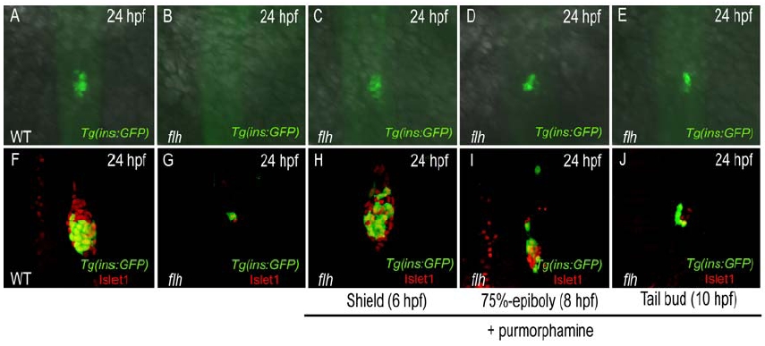 (A-J) Dorsal views (A-E) and confocal projections (F-J) of 24 hpf wildtype (A and F) and flh mutant embryos untreated (B and G) or treated with 20 μM purmorphamine starting at 6 (C and H), 8 (D and I) and 10 (E and J) hpf. Embryos were stained for GFP (A-J) and Islet1 (F-J). (A and F) wildtype embryos show one cluster of Tg(ins:GFP) and Islet1 expressing cells. (B and G) Untreated flh mutant embryos show at most two pancreatic endocrine cells. (C and H) Purmorphamine treatment of flh mutant embryos starting at 6 hpf (shield stage) fully restored Tg(ins:GFP) and Islet1 expression, comparable to wildtype (A and F). (D-E and I-J) Purmorphamine treatment of flh mutant embryos starting at 8 (75%-epiboly stage; D and I) or 10 (tail bud stage; E and J) hpf partially restored Tg(ins:GFP) and Islet1 expression, and with decreasing efficiency as the drug was added at later time points during gastrulation.