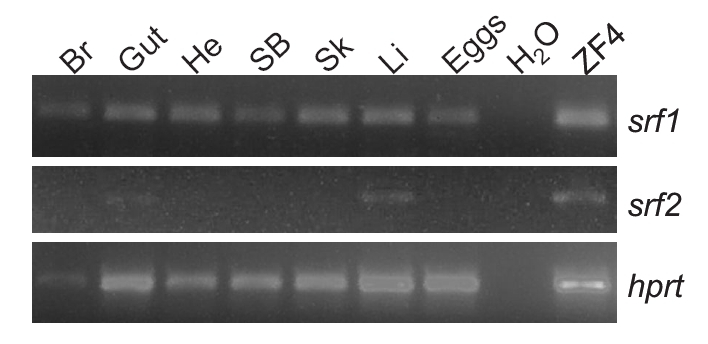 Fig. 3 Adult tissue expression of srf mRNA. Indicated tissues were harvested from 3 month-old zebrafish and cDNA templates prepared with primers specific to each target mRNA as described in Materials and Methods. Abbreviations: Br, brain; He, heart; SB, swim bladder; Sk, skeletal muscle; Li, liver. ZF4 is an embryonic zebrafish fibroblast cell line. hprt is a control mRNA to validate presence of relatively equal amounts of total RNA. These results are representative of two other independent studies.