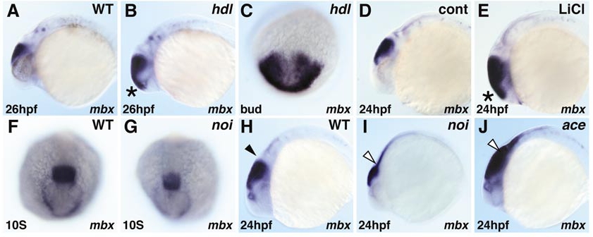Fig. 3 mbx expression in mutant embryos. Whole-mount in situ hybridization of mbx. Black and white arrowheads indicate the MHB and putative MHB region, respectively. In headless (hdl) mutants, mbx expression is expanded rostrally at bud and 26-hpf stages (B, C). Similarly, anterior mbx expansion at 24 hpf is observed in embryos treated with 0.3 M LiCl just after shield stage (E). In the no isthmustu29a (noi) mutant, mbx expression is slightly diminished at the 10-somite stage (G), and reduced in intensity but expanded caudally at 24 hpf (I). In the acerebellarti282a (ace) mutant, mbx expression in the tectum is retained and again expanded caudally (J).